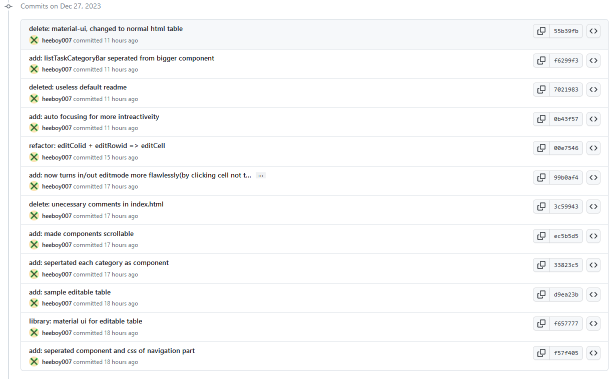 처음 만들어진 형태는 위와 같았다. 이 과정에서 material-ui라는 라이브러리를 깔아서 넣어봤는데 위와 같이 테이블이 자동으로 스타일이 딸려와서 만들어 졌다. 근데 정작 코딩을 하다보니 material-ui를 이용해서 테이블을 수정가능하게 만든게 아니라 결국 내가 만든 코드베이스가 수정 가능하게 material-ui를 조작하는 방식에 가깝다고 느꼈다. 그래서 그냥 라이브러리는 빼버리고 기본 html 테이블을 이용해서 만들기로 했고, 그게 아래의 최종 결과이다.