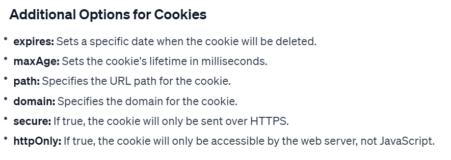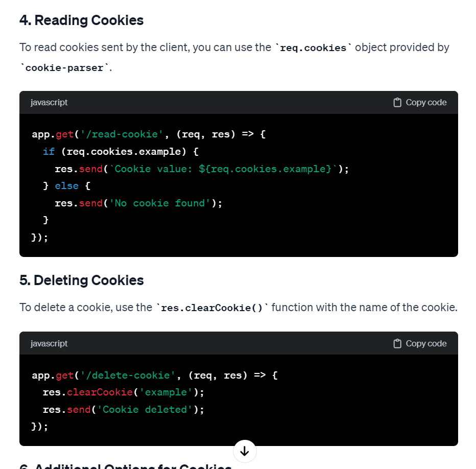 koa에는 cookie를 다루는 기능이 내장되어 있지만, express는 그렇지 못하므로, cookie-parser를 이용해야 한다. express에서 cookie를 읽고 쓰는 방법은 chatgpt도 쉽게 알려 준다.