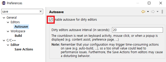 그 다음은 자동 저장 세팅이다. 이번엔 왼쪽 상단의 검색 창에 save를 검색하자.