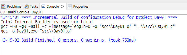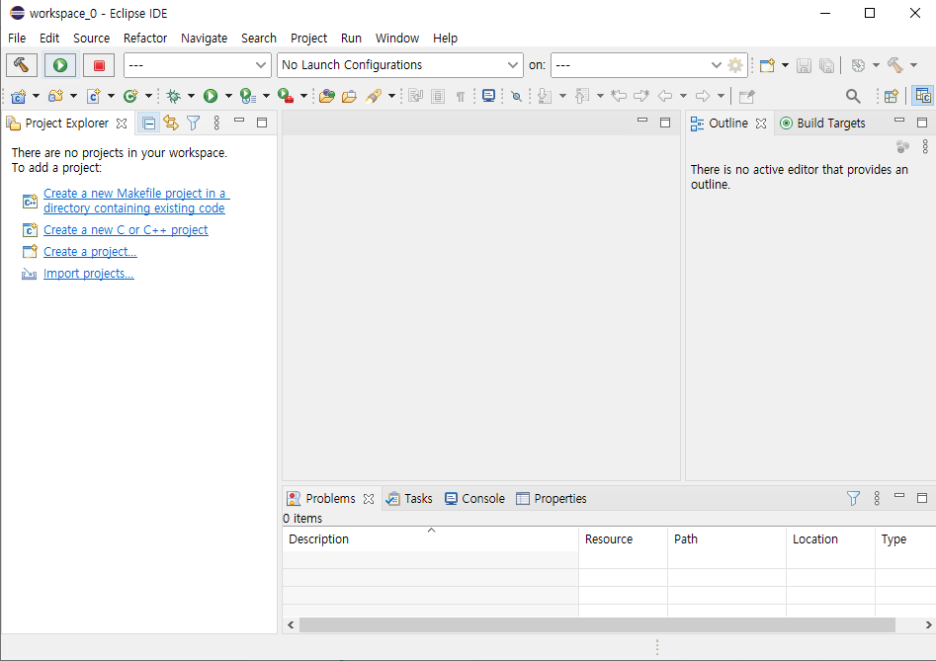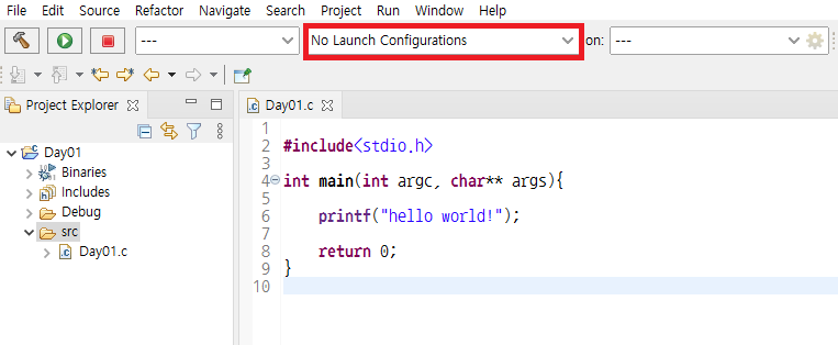 화면에 보이는 No Launch Configurations를 눌러서 아래에 나오는 New Launch Configuration을 눌러주자. 아니면 [Run] -> [Run Configurations...]를 눌러도 된다. 거기서 [C/C++ Application]을 더블 클릭해서 선택하고, Finish를 눌러주자. 빌드가 제대로 되어서 exe가 만들어 졌다면, 자동으로 선택해 줄 것이다. 이젠 좌측 상단의 초록색 플레이 버튼을 눌러주자.