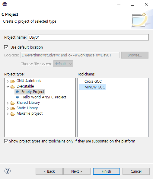 Project Name에 원하는 프로젝트를 입력한다. Toolchain에 Cross GCC와 MinGW GCC가 있는데 필자는 MinGW로 했다. 필자가 MinGW를 자주 사용했기 때문에 쓴 것이므로 일부러 MinGW로 할 필요는 없다.