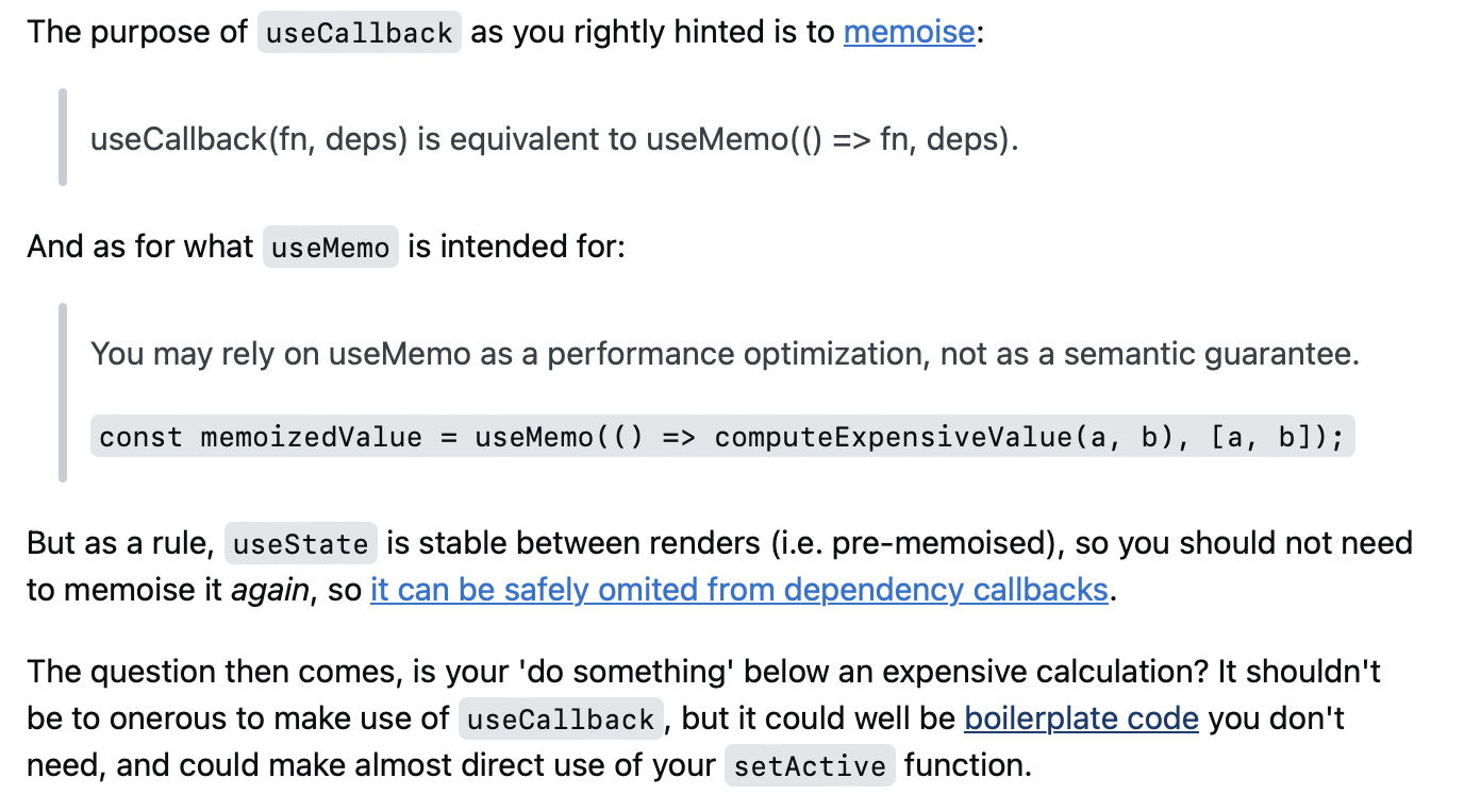 const [active, setActive] = useState(false); const onActiveChanged = useCallback( isActive => () => { // do something setActive(isActive); }, [setActive...