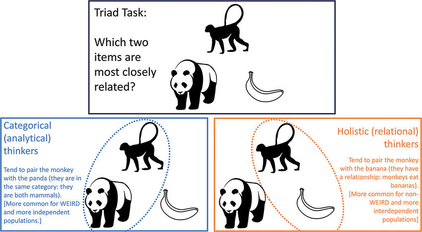 그럼 각설하고 이야기해보도록 하자... 우선은 "구조적 사고"에 대해서이다. 찾아보니, 심리학에 100% 내가 설명하고자 하는 게 있진 않지만, 인지심리학의 analytic vs holistic thinking 이 그나마 주제는 제일 비슷하다. 분석적 사고 / 맥락적 사고에 관한 대비인데, 간단하게 "하나를 좀 더 집중적으로 보는가 vs 전체를 판단해서 보는가"이다. MBTI로 따지면 N이냐? S냐? 와도 비슷한 경향은 있다만 100% 일치하진 않는다. (이상 vs 현실에 좀 더 가까운 개념이고, 위의 이론과 인과관계 내지는 상관관계 정도는 있을 것으로 보인다.)