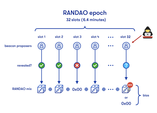 일단 기본적으로는 이것만 해도 $R_{new}$를 조작하는 것은 거의 불가능하다. 왜냐? slot은 1개당 12초이다. 즉 12초 안에 block의 header를 propose 해야 하고, 그와 동시에 randao reveal값도 내야 한다. XOR연산 자체는 충분히 쉬운 일이고 $R_{old}$자체도 알려져 있지만 문제는 해시에 대한 역상공격을 12초 이내에 해내야 한다는 말이다. XOR이 되는 건 reveal값 자체가 아니라 그의 해시값이기 때문이다. 이건 확률이 없다고는 못하지만 거의 불가능의 영역에 가깝다.