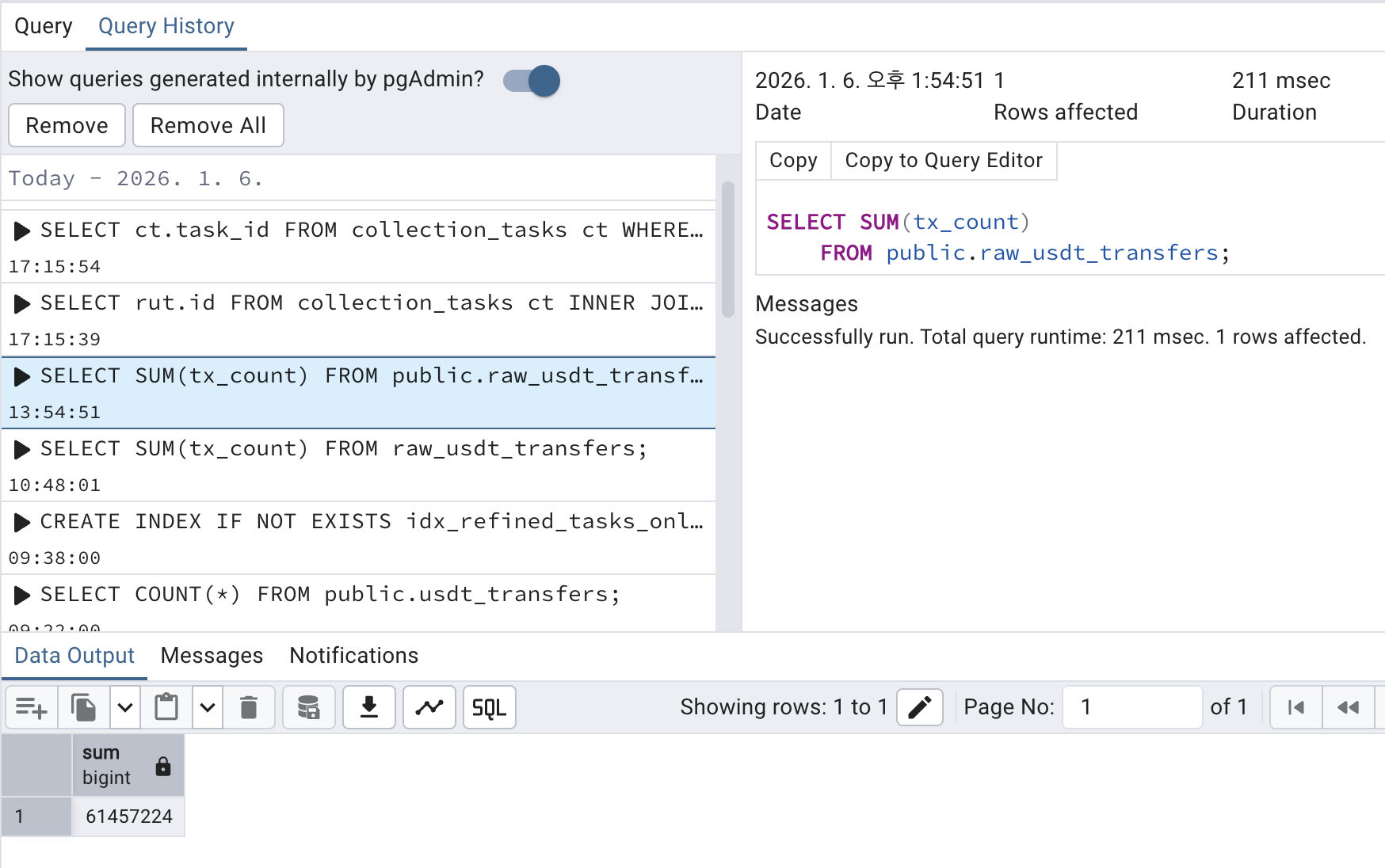 약 6100만 건 정도의 송금 데이터를 얻었다. 아마 이 정도 양이면 나름 그래도 분석해볼 건더기는 있을 것으로 보인다. 이 구조를 그대로 확장해서 energy를 사고파는 행위에 대한 것도 대강 수집을 해볼 예정이고, 아직 부족한 부분에 대한 코드도 보강할 것이다.
