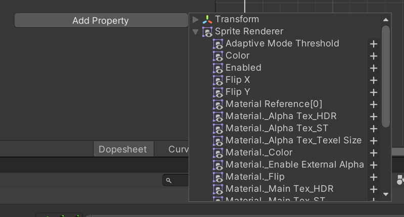 (나는 이미 Add Property를 이용해서 만들어 두었다.) 거기서 SpriteRender의 제일~ 아래에 있는 Sprite라는 옵션을 가져오자. 그렇게 한 다음 아이콘 옆의 작은 화살표를 누르면 현재 애니메이션으로 쓰일 스프라이트가 오른쪽에 보인다.