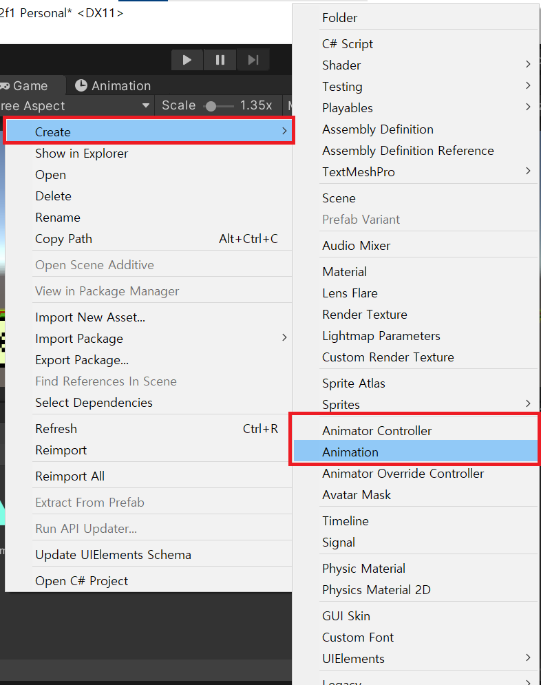 나도 아직 완벽하게 이 애니메이션의 작동방식이나 동작 의도를 파악하지는 못했지만, 이렇게 내가 알아낸 방법들을 적어보려고 한다. 우선 애니메이션을 생성할 기틀을 만들어야한다. 만들어둔 Asset/Animation폴더에 들어가서, 아래 처럼 Animation Controller(Animator)와 Animation을 만들어 준다.