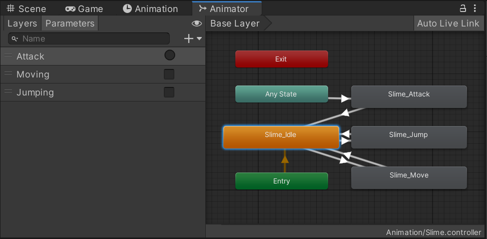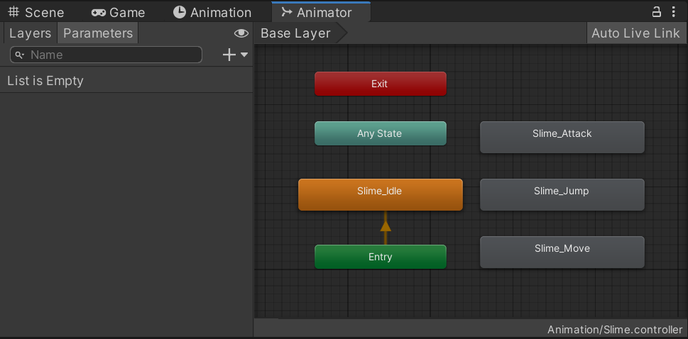 이제 슬슬 눈치 챘겠지만 Any State는 애니메이션이 어디서 실행 중이던지 싹 무시하고 조건만 맞는다면 Slime_Attack 애니메이션을 실시한다. 그래서, 조커카드 같다는 느낌을 준다. 아마 프로그래머라면 알겠지만, 강제로 흐름을 끊고 건너뛰는 스파게티 코드는 좋지 않다. 배운 적은 없지만, Any State를 남용하면 분명 문제가 생길 듯 싶다. (그래도 이런 작은 애니메이션에 쓰는 거 정도는 괜찮을 듯.)