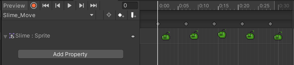 그럼, Slime을 애니메이터에 넣어놓았으니, Slime을 Hierarchy창에서 지정한 상태로 Animation 창을 들여다보자. 우선, Slime_Jump상태의 에니메이션을 우선 제작할 것이므로 Perview아래의 드롭다운 메뉴를 Slime_Jump로 바꾸자. 그리고 Add Preperty를 누른다.