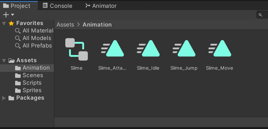 컨트롤러는 한 개, 애니메이션은 각각의 상태에서 보일 애니메이션의 개수에 따라서 적절히 조절하면 된다. 이렇게 만들어 두었다면 Slime의 인스펙터에서 Animator를 한개 찾아서 더해준다.(Animation 아니라 Animator)