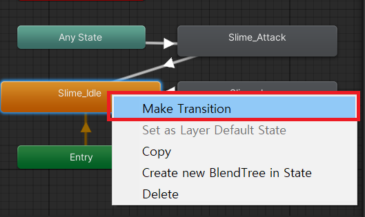 그 이후에는 Transition을 우리가 직접 만들어야한다. 마우스 오른쪽 버튼 -> Make Transition 옵션을 이용해서 아래와 같이 맵을 만들어 두자.