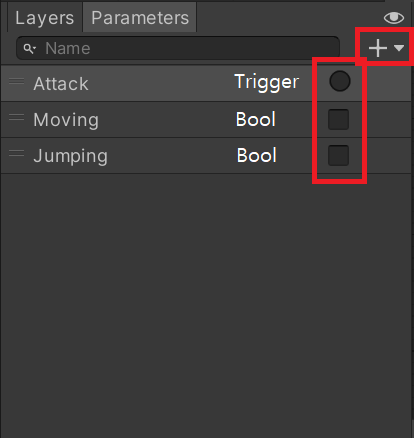 Trigger와 Bool은 비슷하지만, Trigger는 한번 실행 된 후에는 알아서 False가 되는 반면, Bool은 그대로 남아 있다는 차이가 있다. Attack은 다시 Attack을 하기 전까지는 애니메이션을 다시 실행시킬 이유가 없으므로 Trigger, 나머지 동작들은 다시 그 동작을 멈추기 전까지는 계속해서 애니메이션을 실행해야하기 때문에 Bool을 이용한다. 물론 Integer 등을 이용해도 괜찮다.
