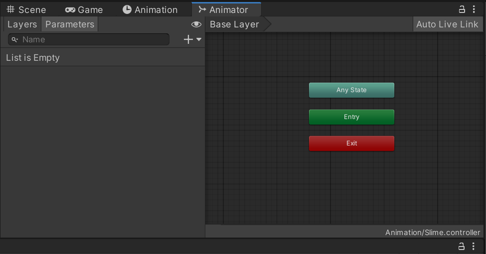 Any State, Entry, Exit는 움직일 수 있는 아이들이다. 위치가 약간 다른 이유는 내가 약간 옮겨 놓았기 때문이다. 이것들이 무슨 역할을 하는지를 알기 위해서는 우리가 만든 애니메이션도 필요하다. 우선, 기존에 만들었던 Slime_Idle 애니메이션을 먼저 드래그 앤 드롭하고, 나머지를 전부 드래그 앤 드롭하자. 대강 이렇게 된다 :