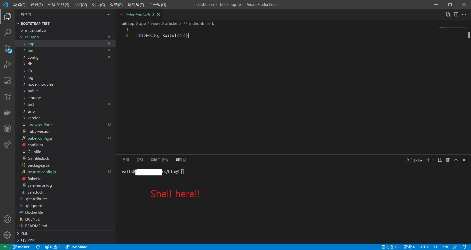 그 도커파일을 만든 디렉토리 에서 vscode를 열고, 터미널에 이렇게 입력하면 된다.