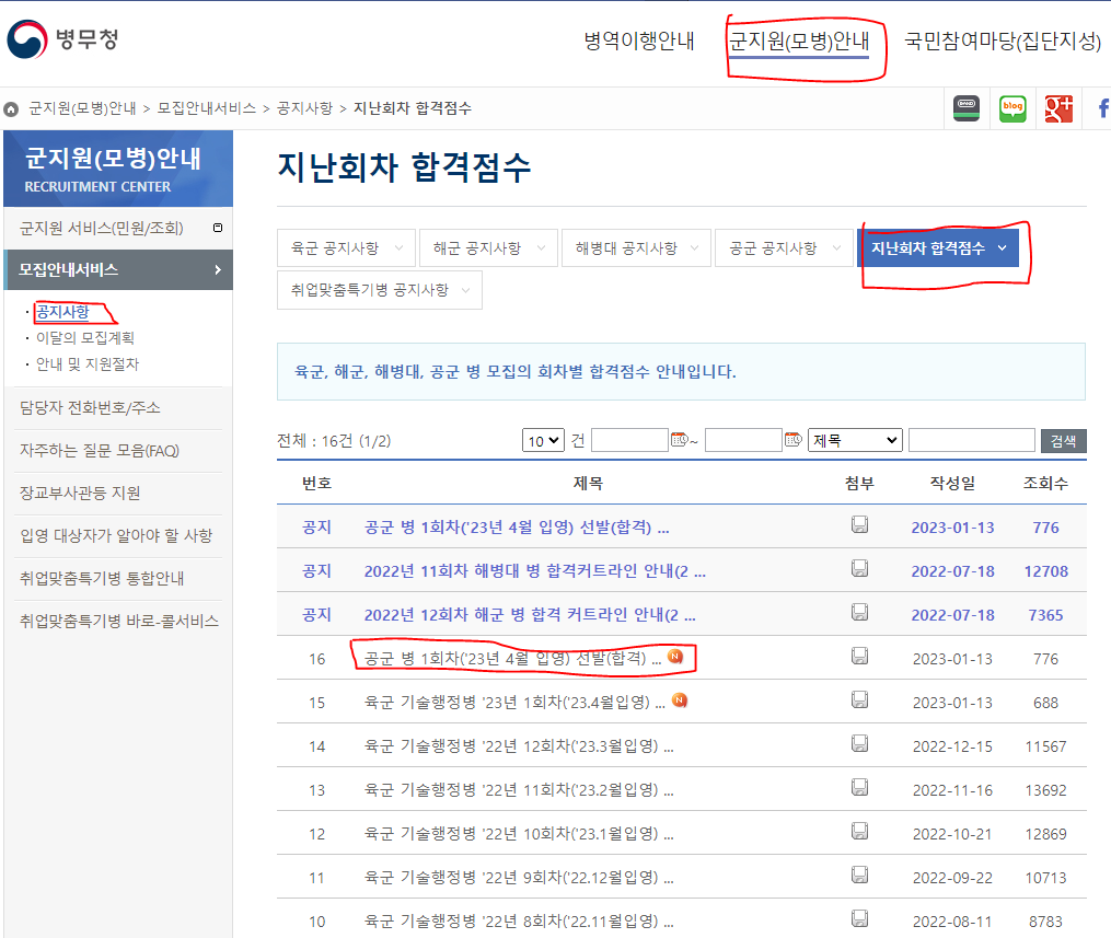 병무청 -> 군지원(모병)안내(병무민원 사이트가 아닙니다.) -> 모집안내서비스 -> 공지사항
