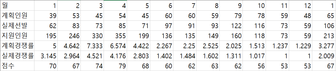 -> 지난회차 합격점수 -> 공군 검색 -> pdf다운로드 -> 커트라인 및 실제 선발인원 추출