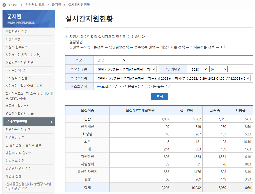 병무청 -> 병무민원 -> 군지원 -> 실시간지원현황