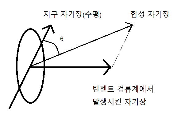 지구 자기장과 합성 자기장이 이루는 각을 내부에 놓인 나침반을 이용해서 파악하면, tan θ로 지구 자기장의 크기와 검류계가 발생시킨 자기장의 크기 사이의 비를 알 수 있다.